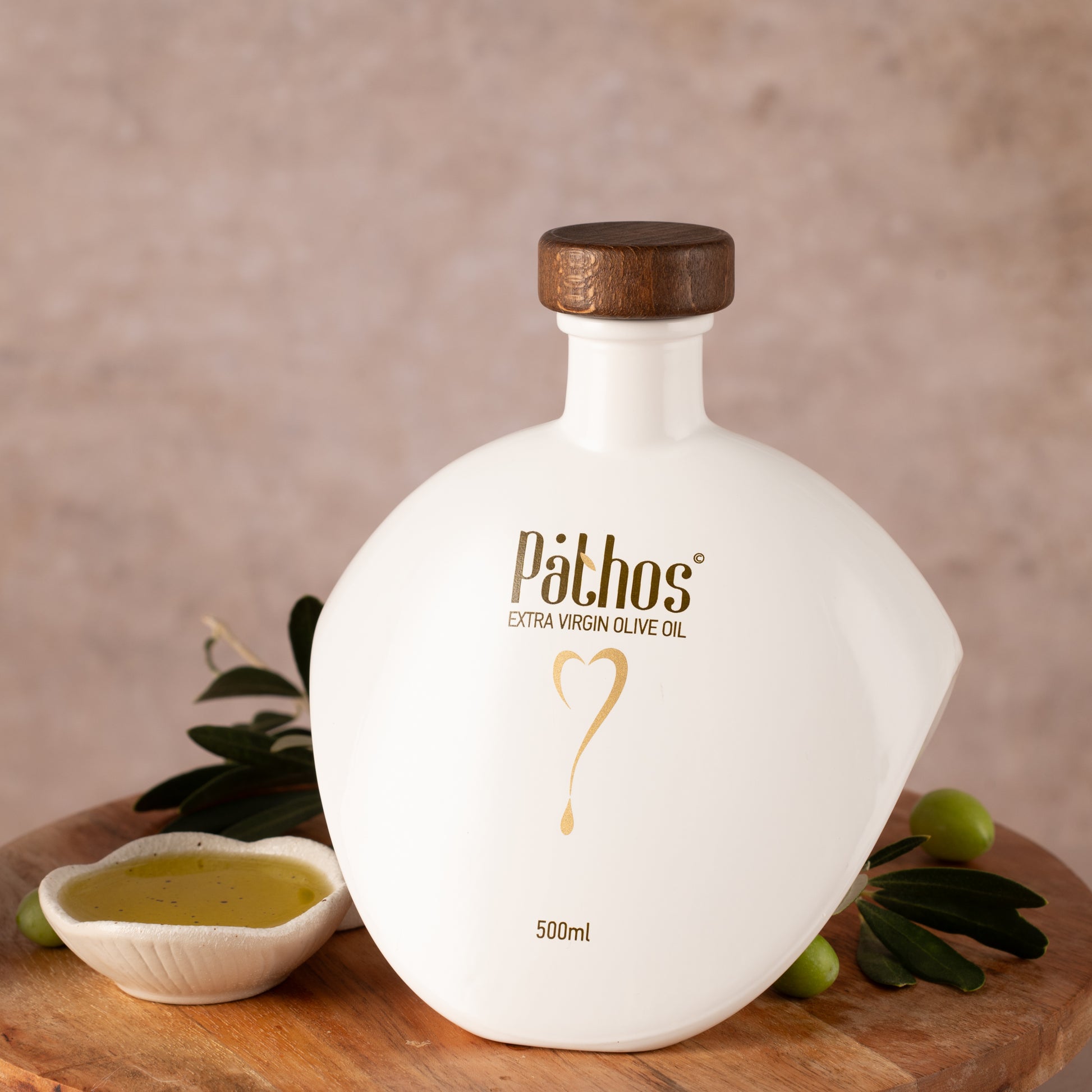 Im Mittelpunkt dieser besonderen Präsenbox steht Pathos Bio (500ml) — ein kretanisches Olivenöl aus Kavalaria Korfes, das die Leidenschaft und Exklusivität der griechischen Olivenölkunst verkörpert.