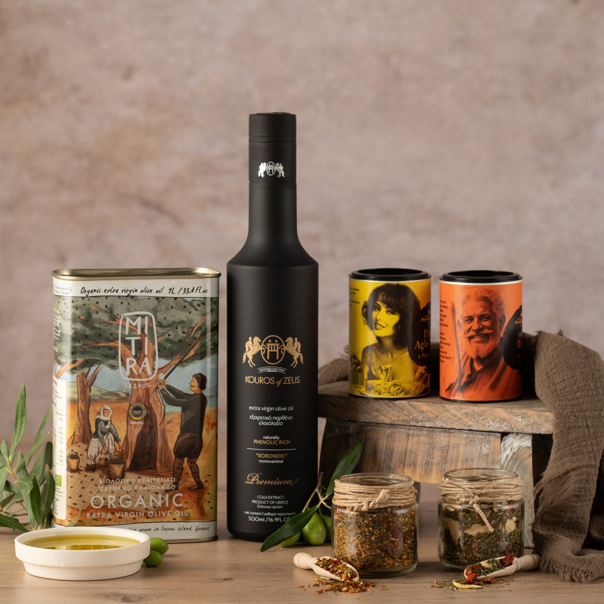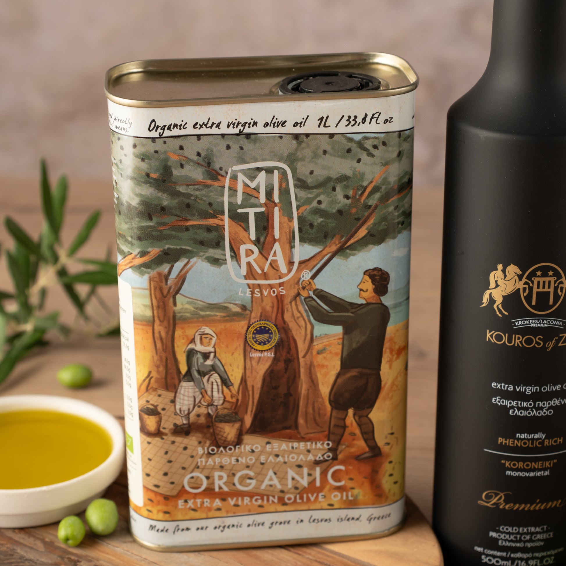 Entdecken Sie die perfekte Geschenkbox mit dem außergewöhnlichen Mitira Bio Olivenöl (1L) aus Mitilini, Lesvos.