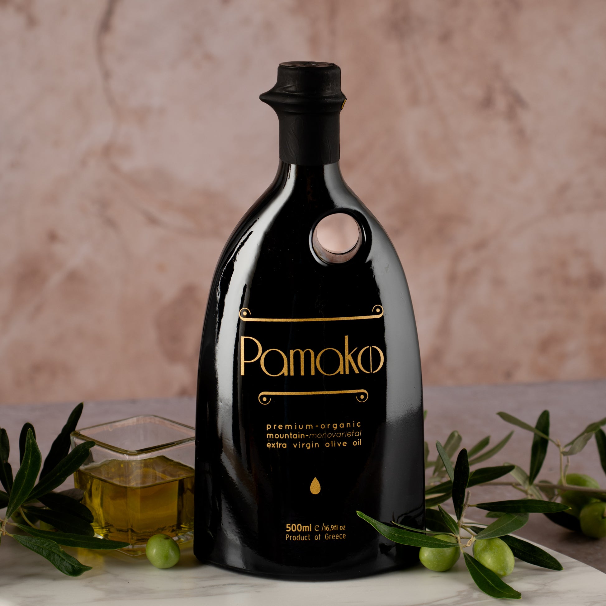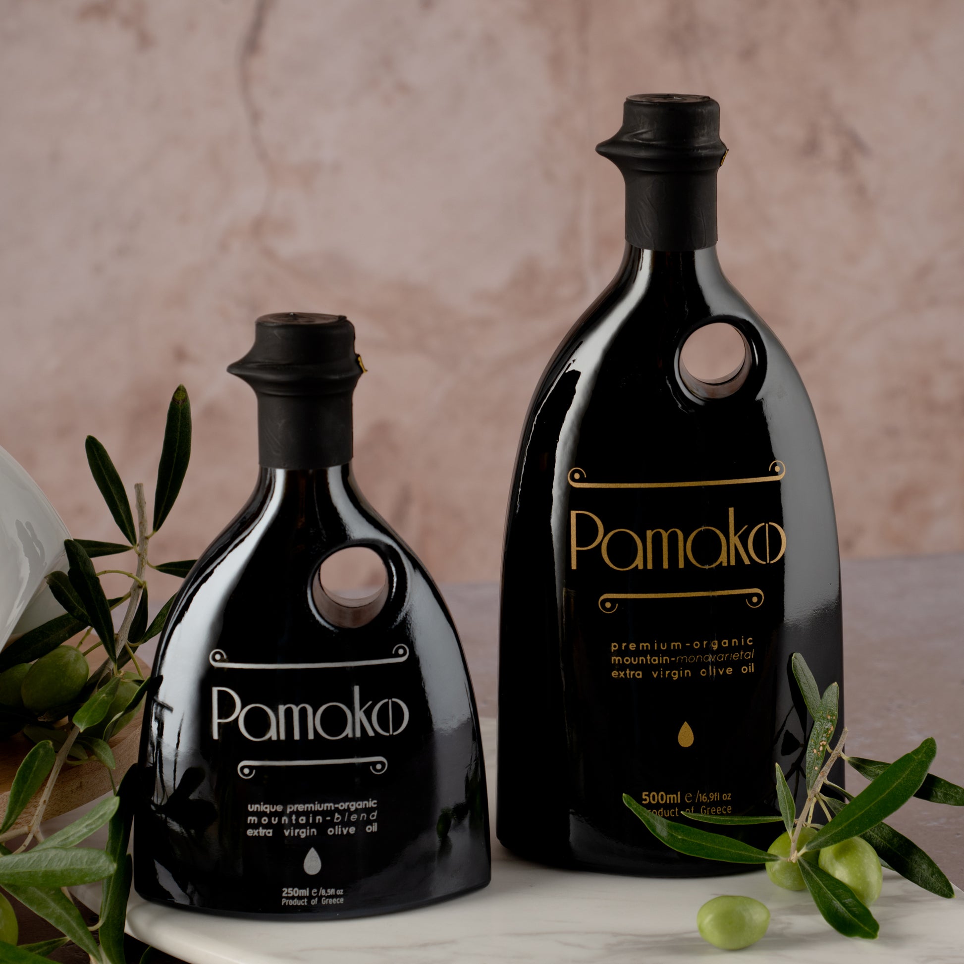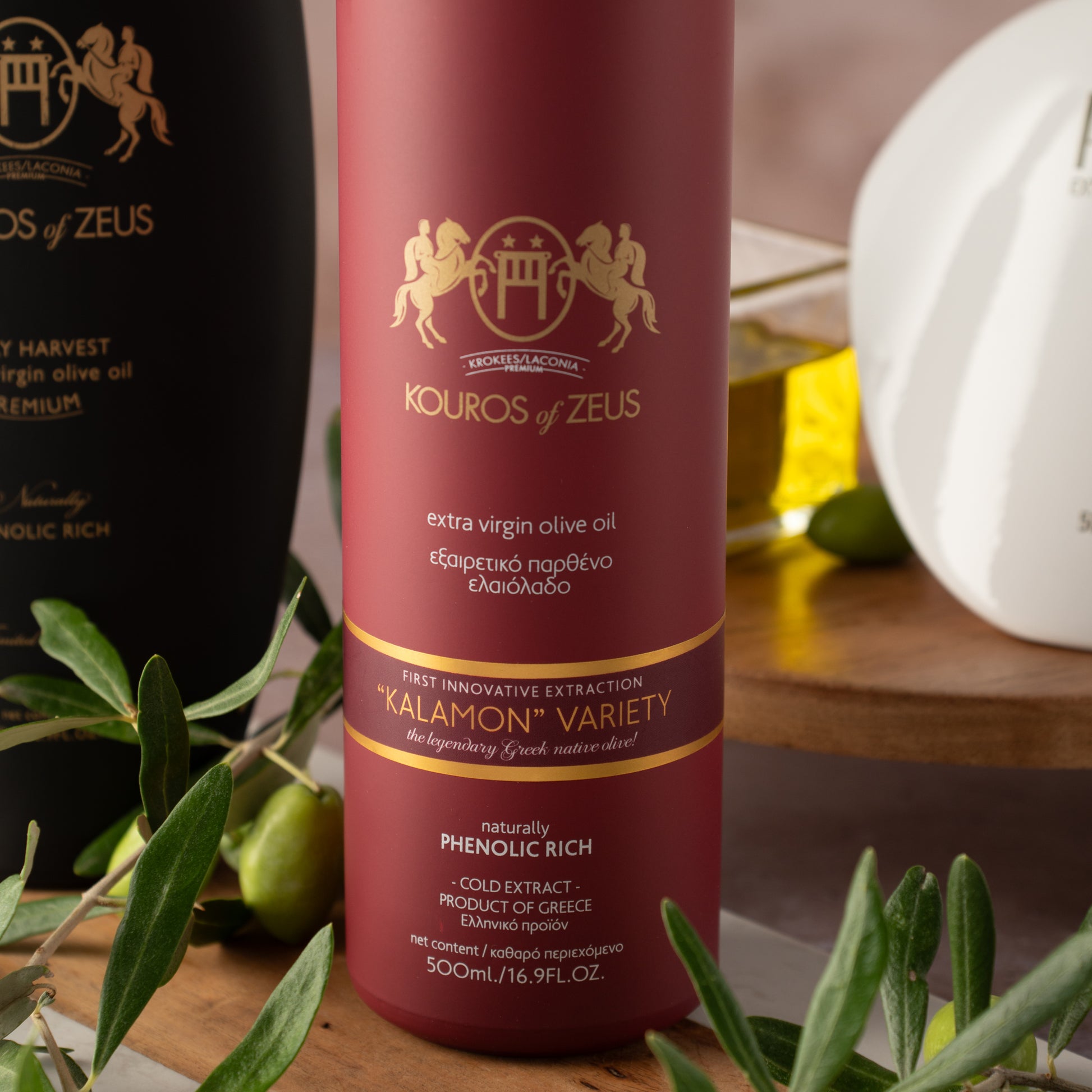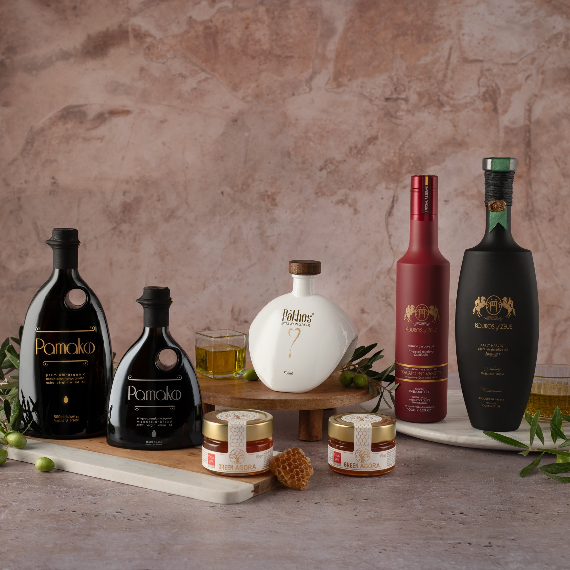 Diese Box vereint fünf der hochwertigsten Olivenöle: Kouros Frühernte, Kouros Limited Edition, Pamako Gold Bio, Pamako Silber Bio und Pathos Bio (alle jeweils 500ml).
