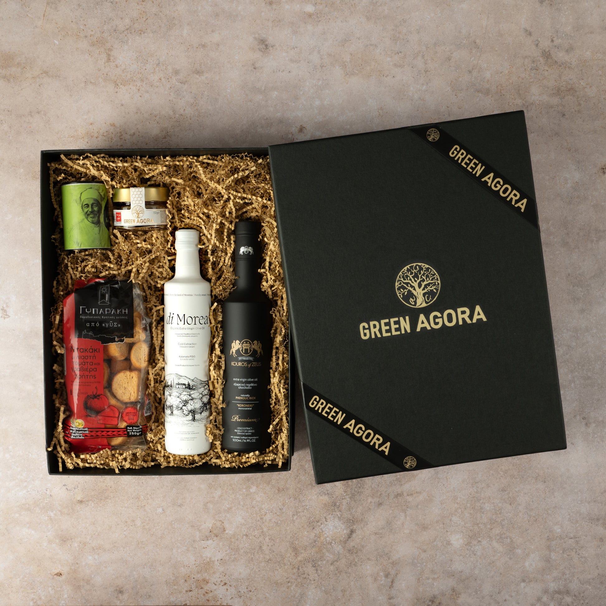 Entdecken Sie unsere exquisite Geschenkbox, die eine Auswahl hochwertiger mediterraner Produkte vereint.