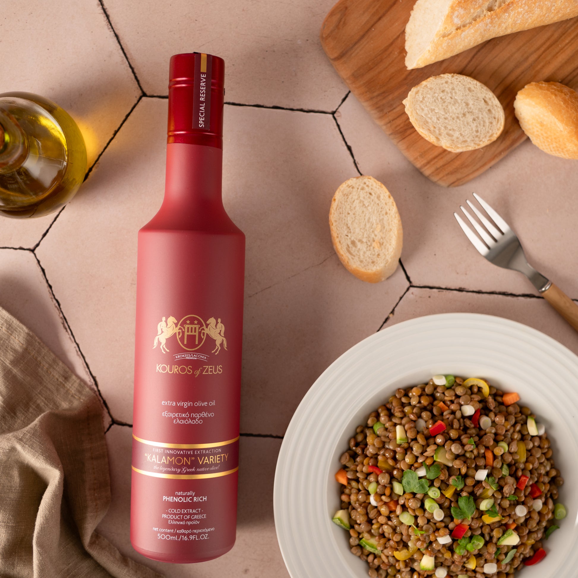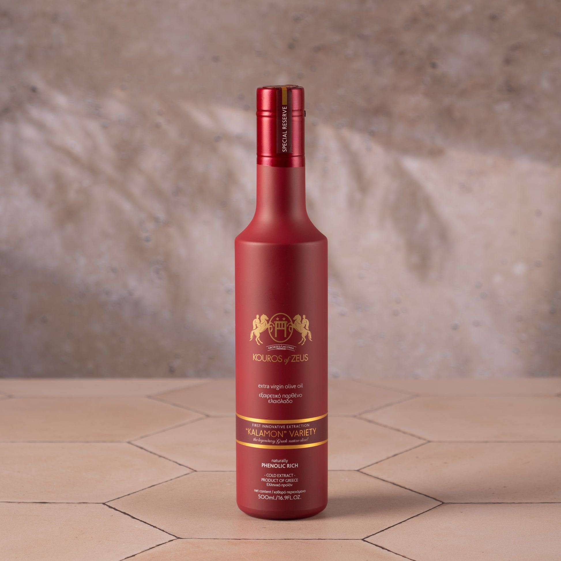 Kouros Frühernte repräsentiert die Spitze der griechischen Olivenölkunst, hergestellt aus erlesenen Kalamon-Oliven aus Krokes in Peloponnes.
